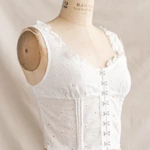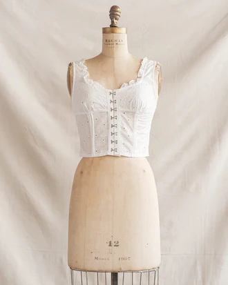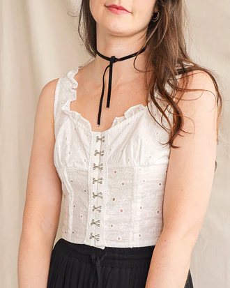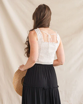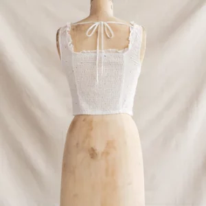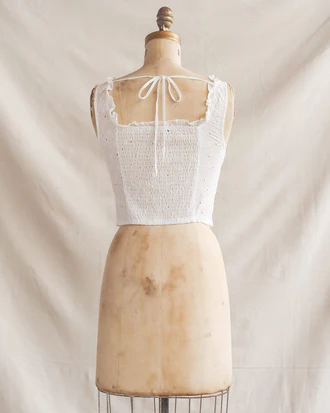 Feminine and romantic vintage inspired white cotton floral eyelet top with hook and eye closures along the front, smocked elasticated panel in back, and ties at back neckline. Semi cropped.