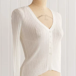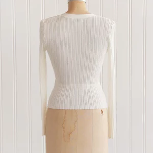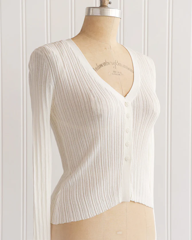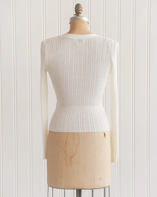 Feminine vintage inspired fitted off white button down knit top with soft and subtle ribbing. This lightweight knit cardigan top can be worn as a layering piece or on it’s own. Material is semi sheer so a skin toned undergarment will need to be worn if wearing on it’s own as a top.